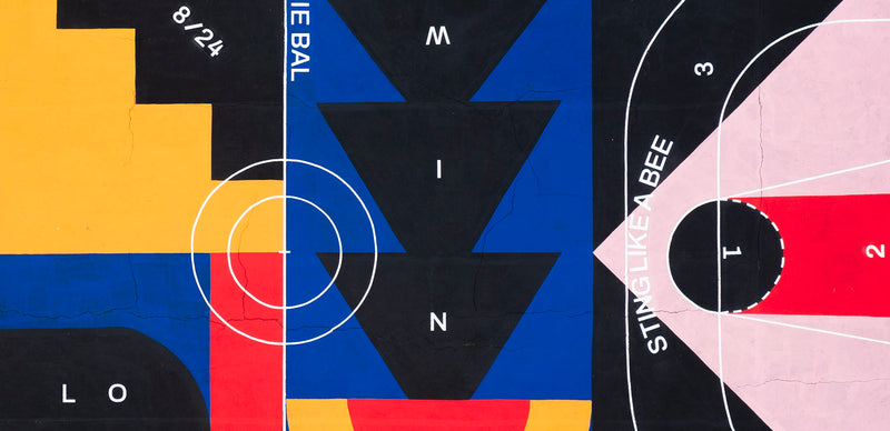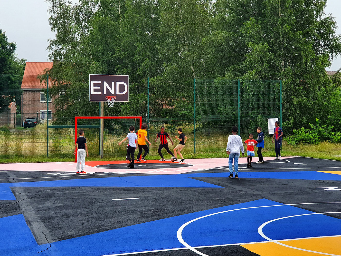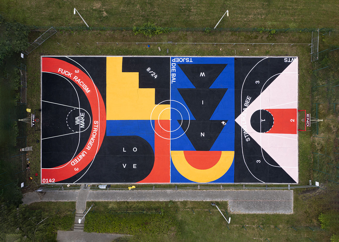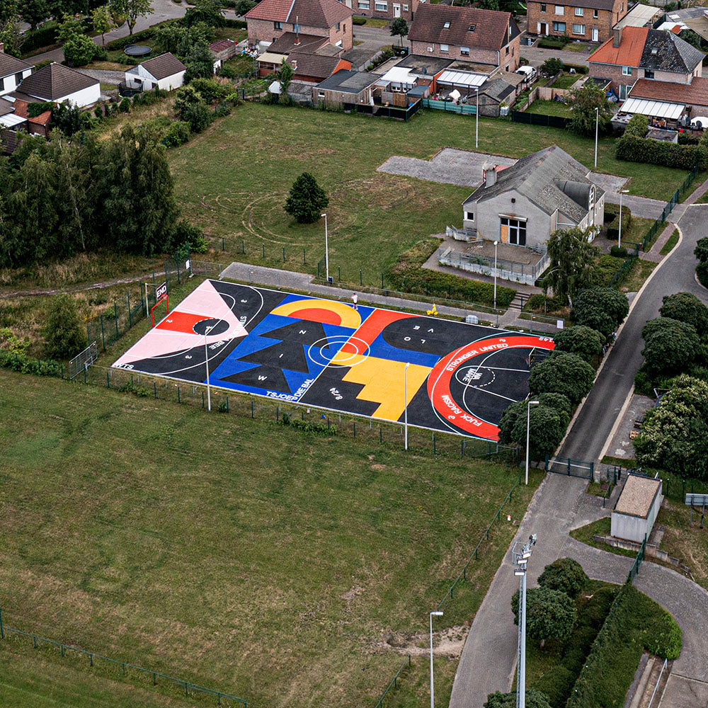 We were called by the city of Genk and C-Mine to paint an entire basketball / football field as part of the SHOUT exhibition (opening 3rd of July) among international artists such as Eike König, James Joyce, Anthony Burrill, Morag Myerscough and well, me. Without a doubt it was the largest mural We've ever painted (20x40m, Marco is the white spot close to the N in the first pic) and without Alley Studio guys and the neighborhood kids help, this project would never have been possible. We love seeing these young fellas already enjoying their new court!