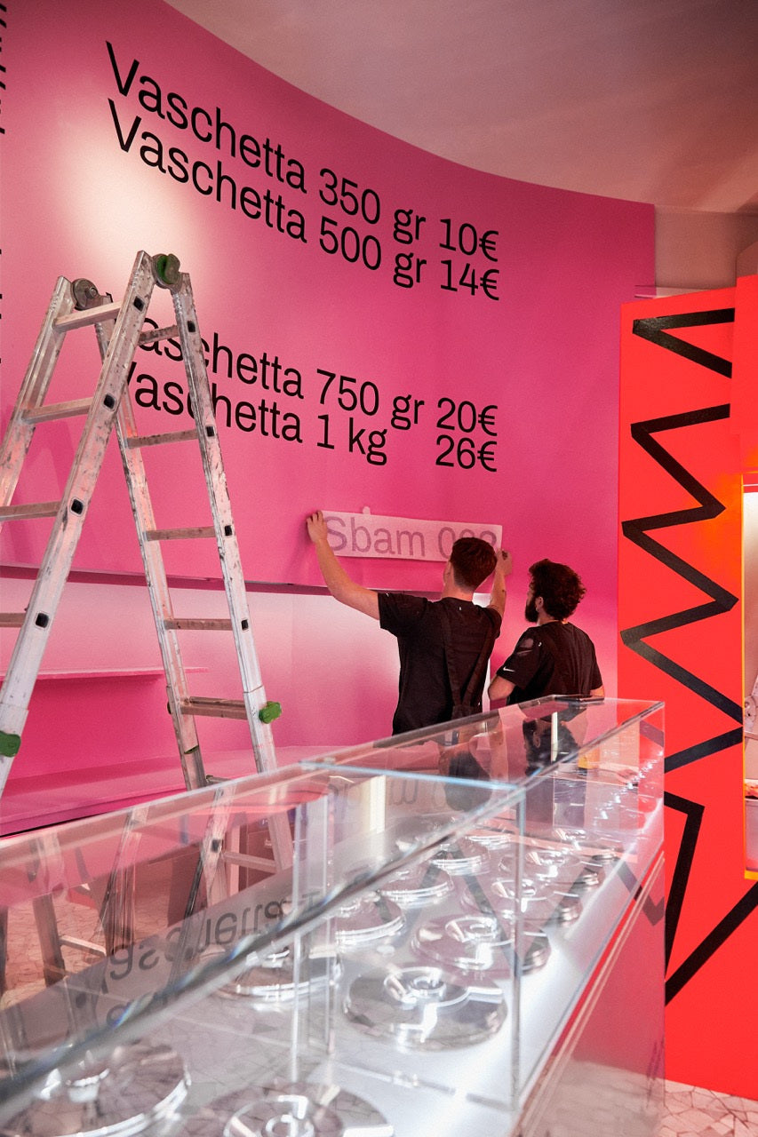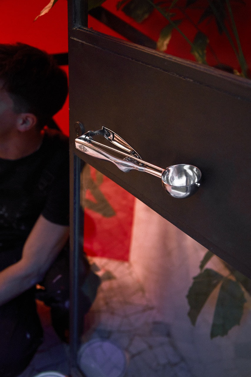 A very small space, with two large windows that want to go outside. The entire store is a great showcase on Federico Ozanam Street.Two large pieces resembling an art installation are introduced into the space to create two sales areas: The ice cream maker with its work space and the display cases resembling a food truck.