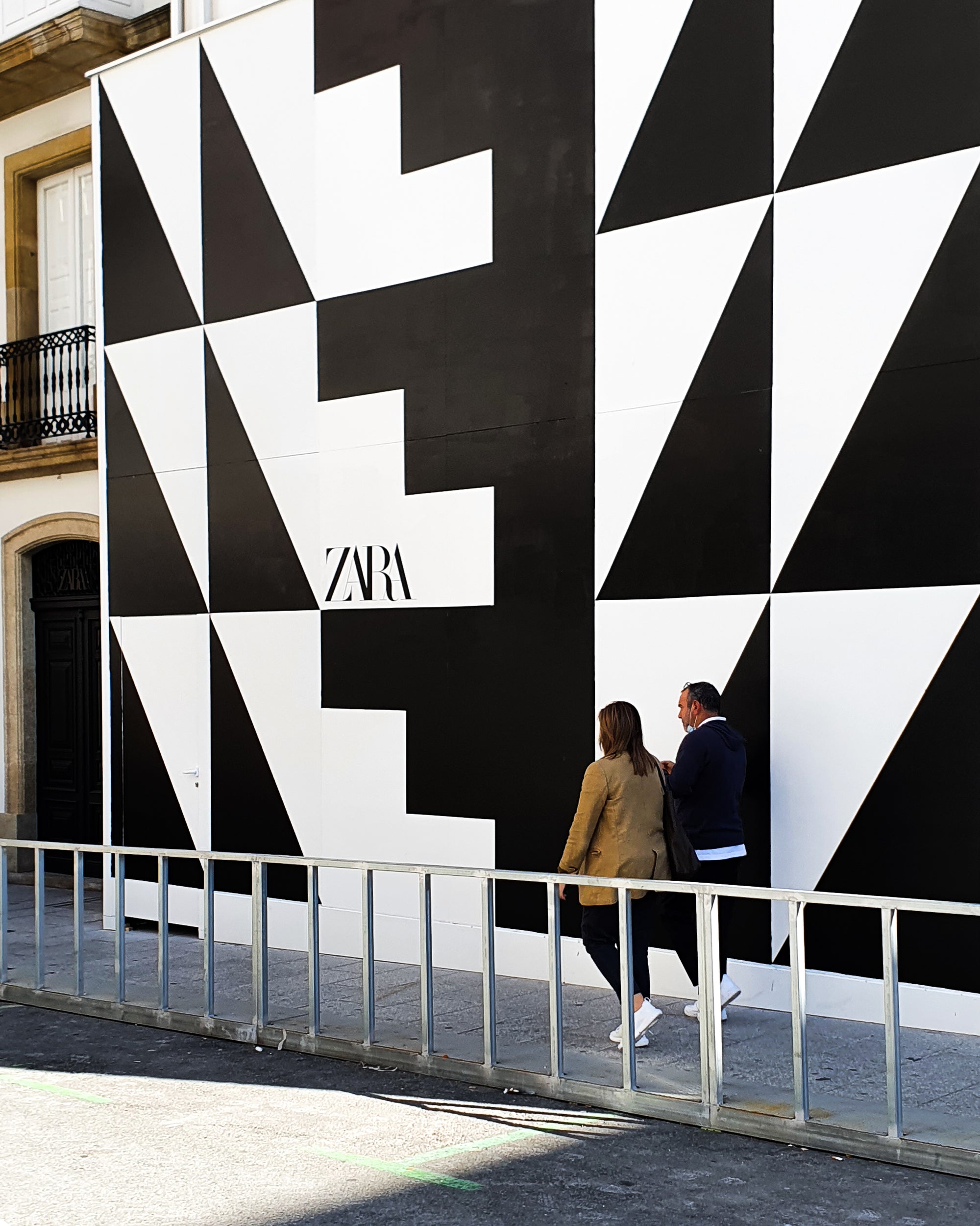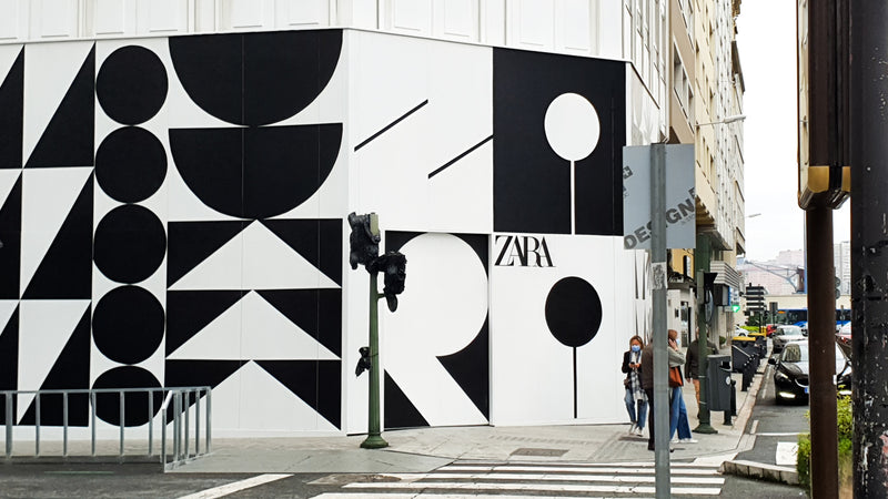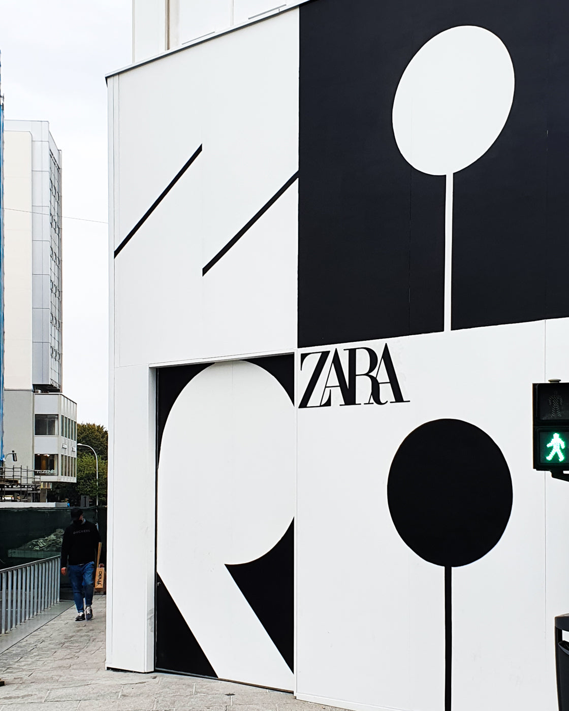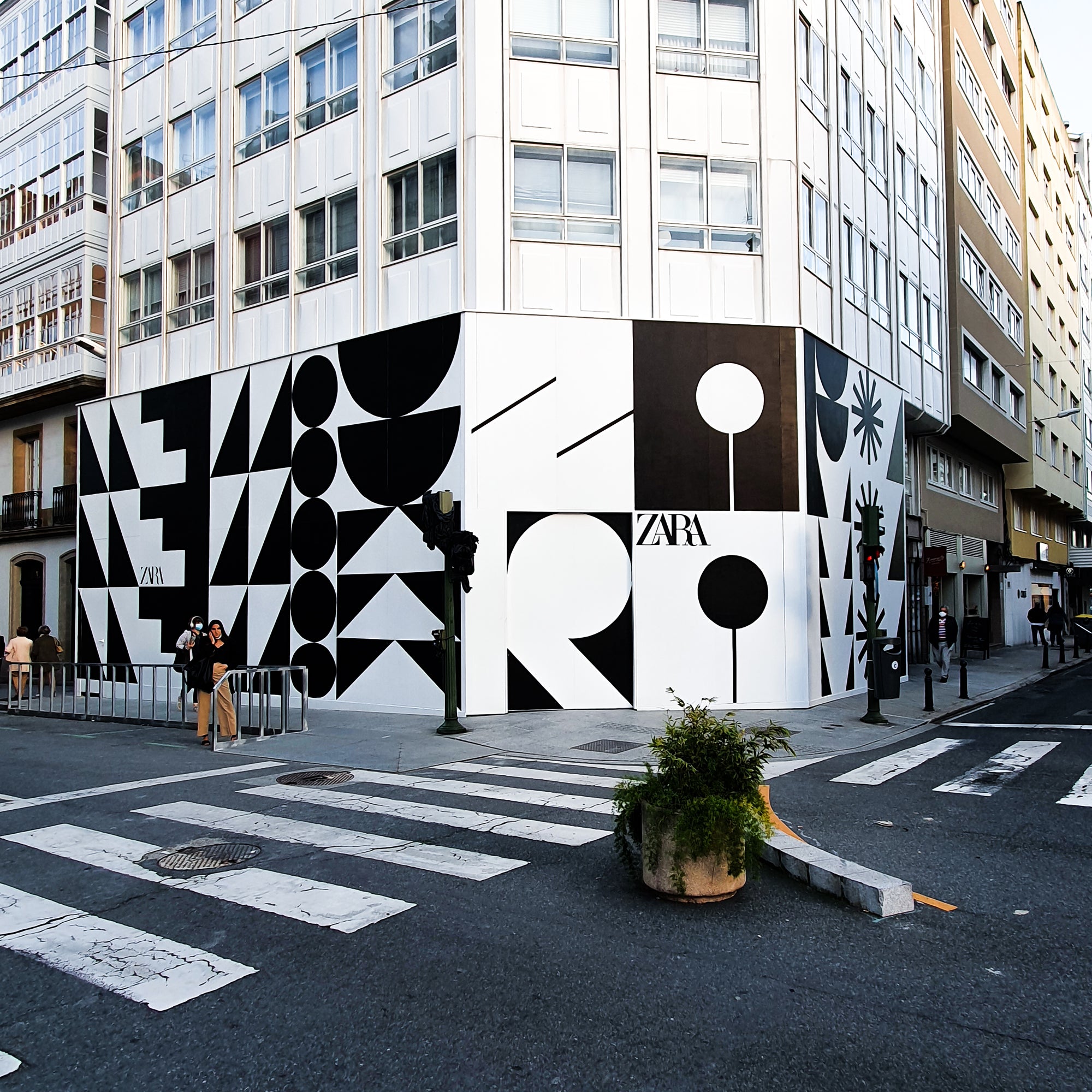 We got commissioned by Zara for creating a geometric black and white only mural for their upcoming store front wall here in the city. This was the first major project entirely handled by my guys at the studio and I can only be more than proud of the fantastic work they have done.In just three days, w managed to perfectly recreate this geometric baby of 6 meters by 25 meters high. Rain, wind and storm did not manage to demoralize the guys, on the contrary, working all day they proved to be hard workers."I come from a small village, I'm not a city man but I like this mural. I don't know what it means but it reminds me of a big chessboard, so I like it" - A passerby told us.