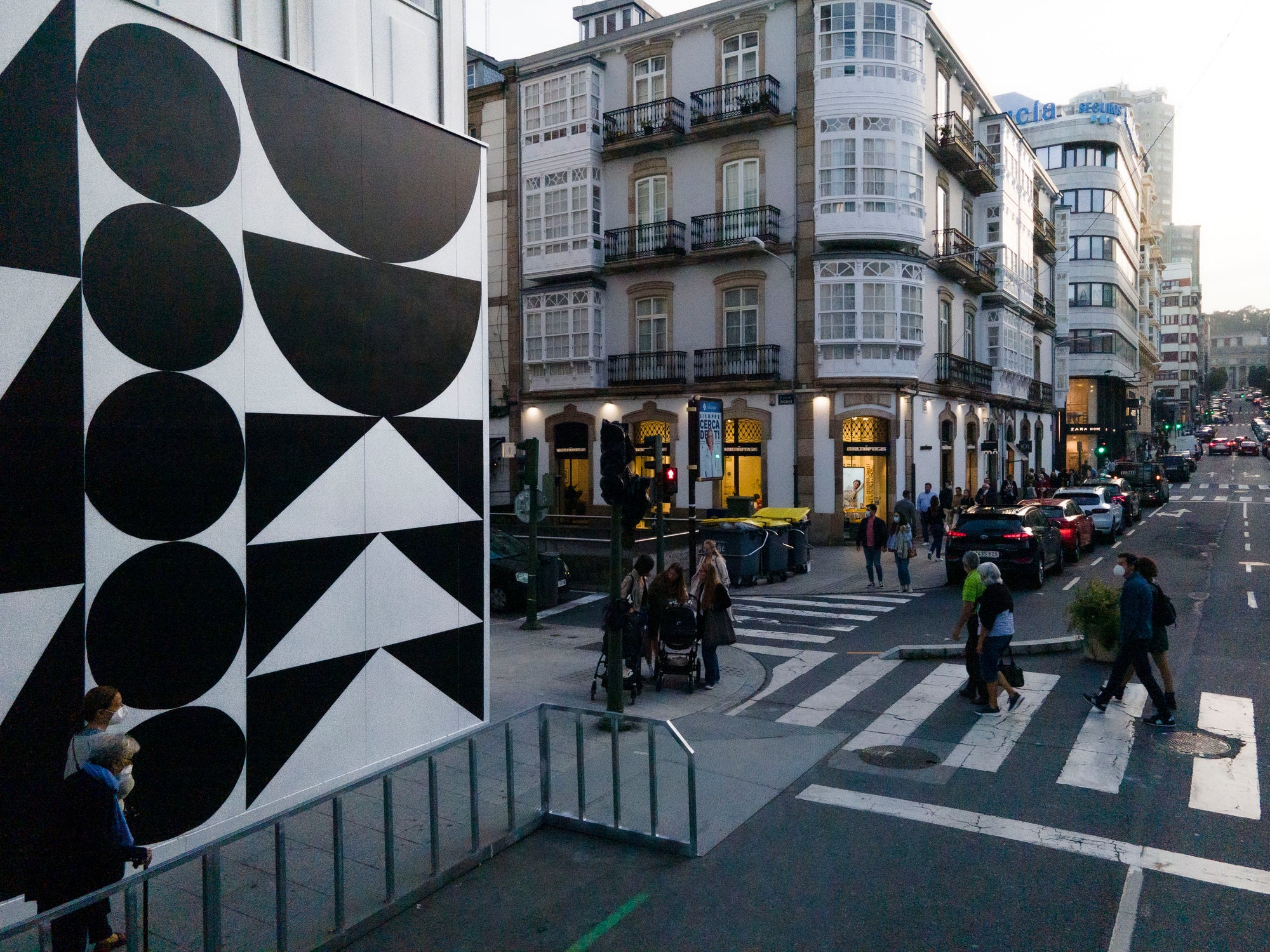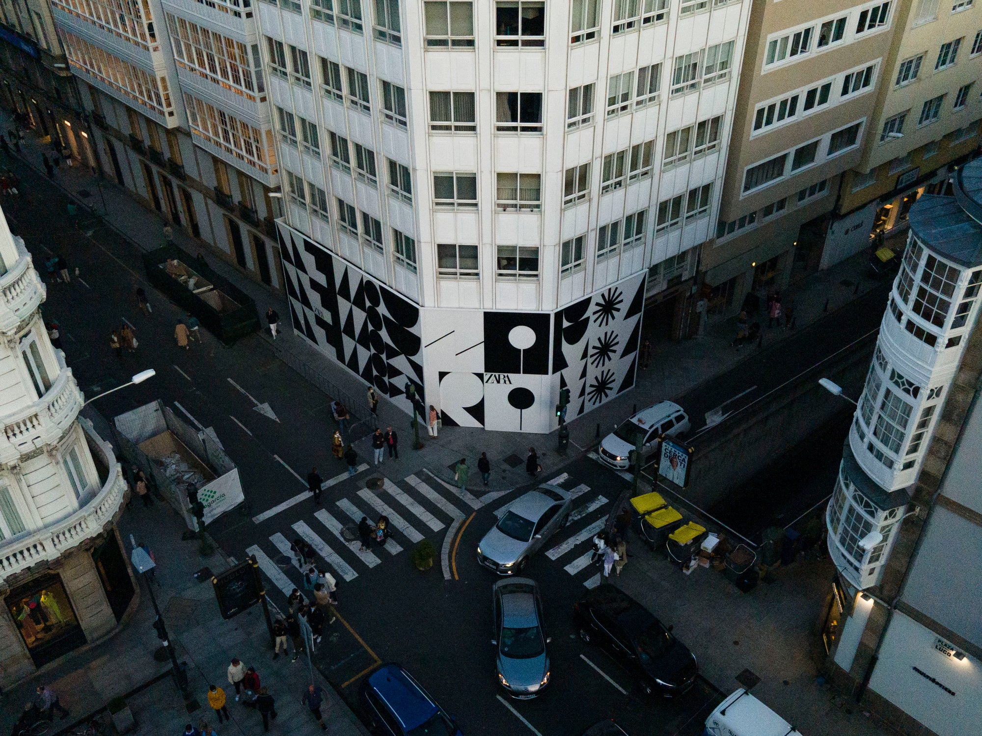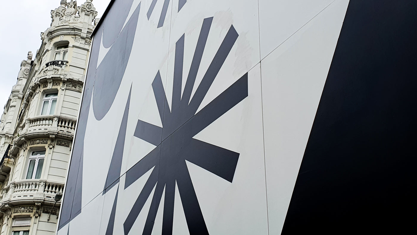 We got commissioned by Zara for creating a geometric black and white only mural for their upcoming store front wall here in the city. This was the first major project entirely handled by my guys at the studio and I can only be more than proud of the fantastic work they have done.In just three days, w managed to perfectly recreate this geometric baby of 6 meters by 25 meters high. Rain, wind and storm did not manage to demoralize the guys, on the contrary, working all day they proved to be hard workers."I come from a small village, I'm not a city man but I like this mural. I don't know what it means but it reminds me of a big chessboard, so I like it" - A passerby told us.